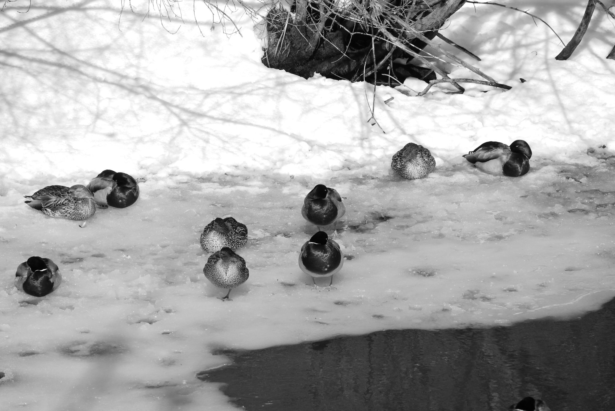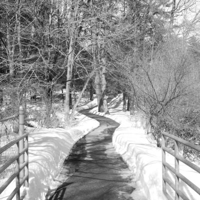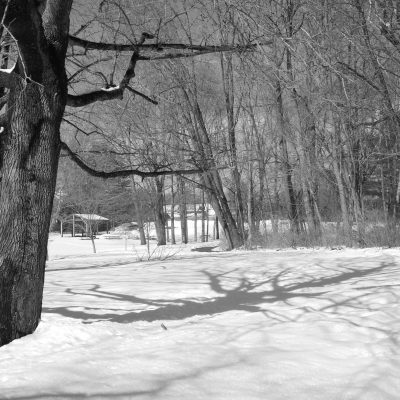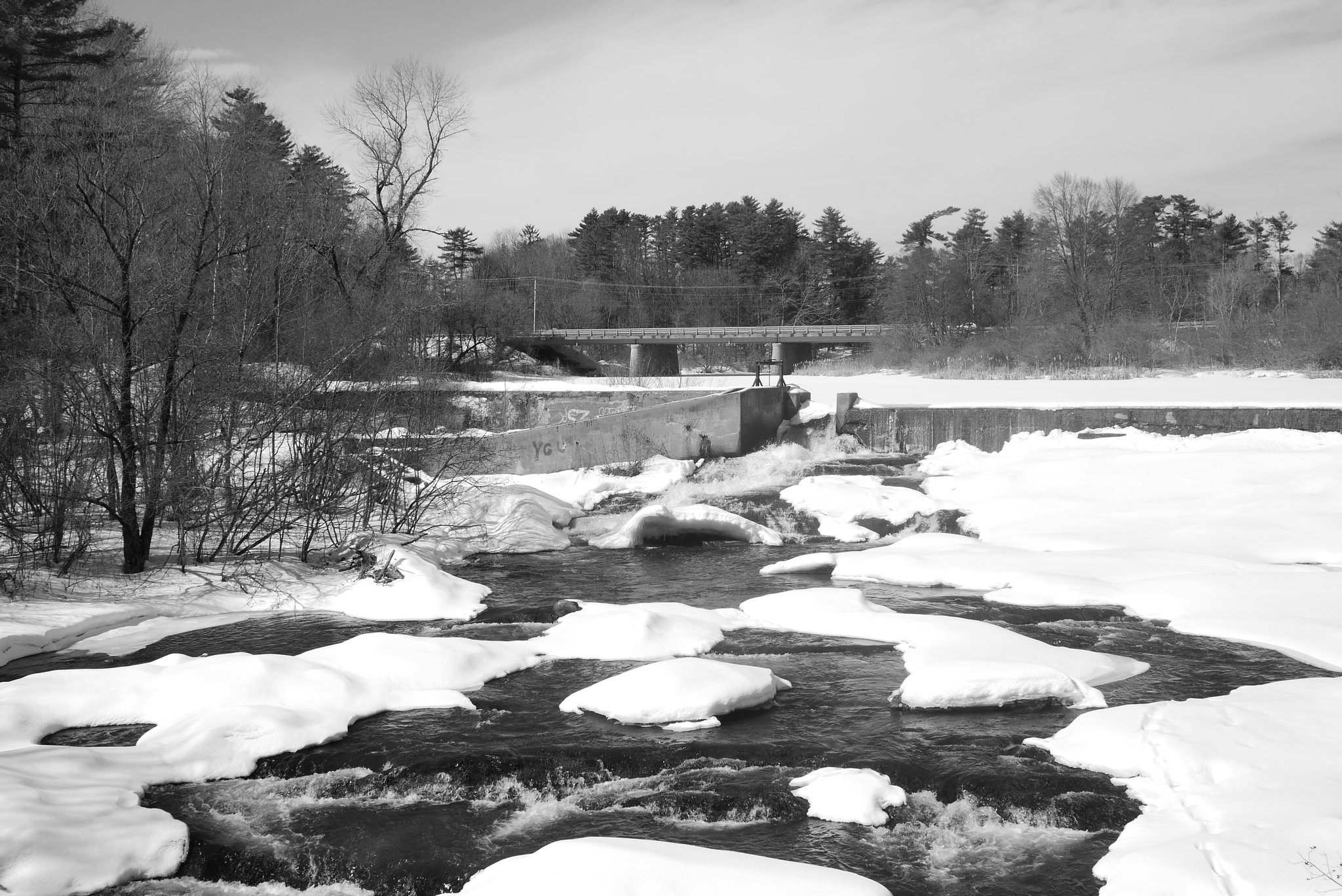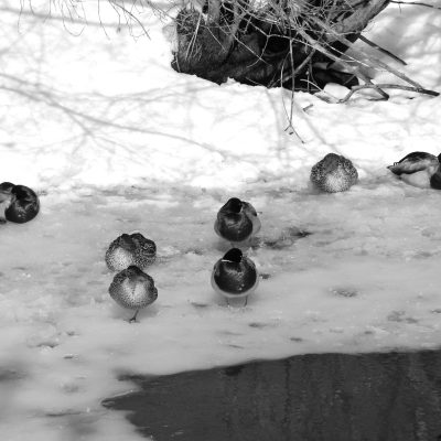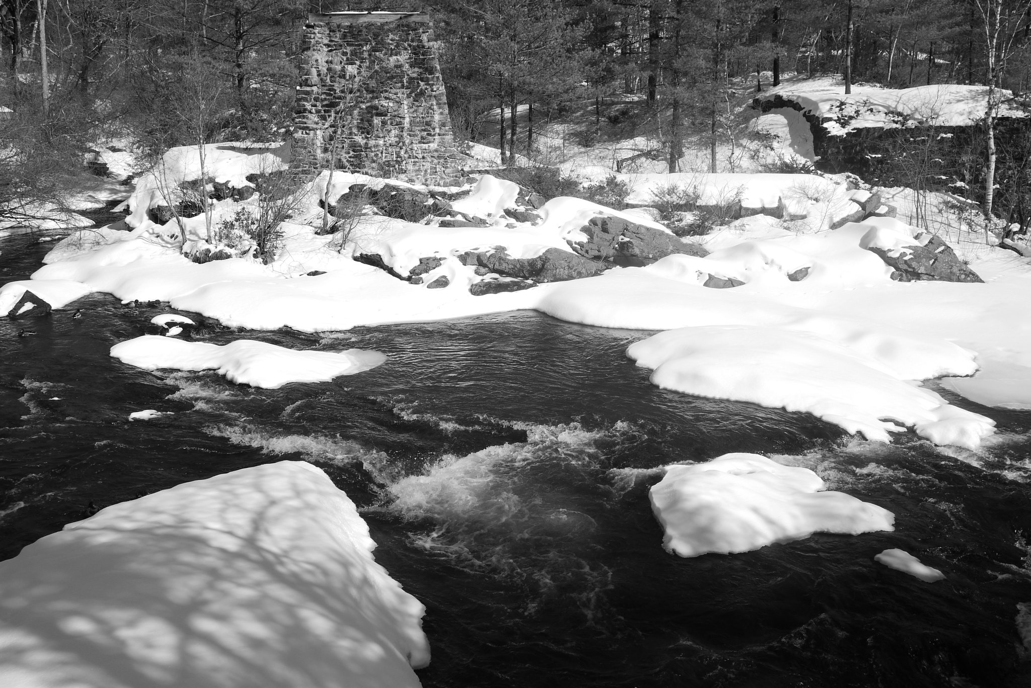 Lindsey and I went for a walk along the Royal River in Yarmouth. The weather was comparitvely warm and sunny, after having receiving a few inches of fresh snow the previous night. Some of that snow was melting quickly, and while most of the river was still frozen over, there were some open spots in the water. Lindsey enjoyed watching the many ducks that were enjoying the sun and open water from the banks of the river. I had fun taking some photos of the ducks with a 45mm-150mm telephoto lens. For the rest of the photos along the walk, I used my 20mm prime lens with the Lumix GF1 and a monochrome “film” setting.