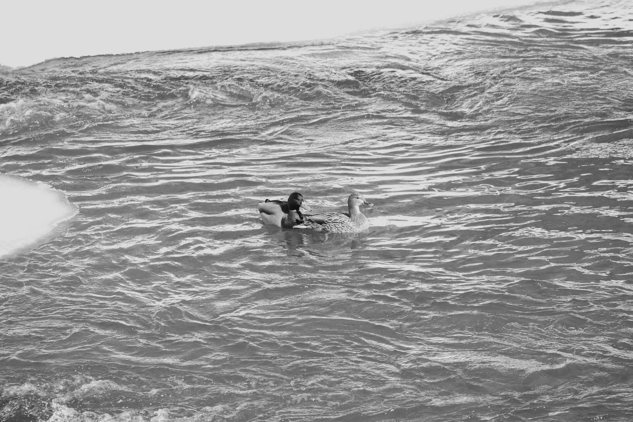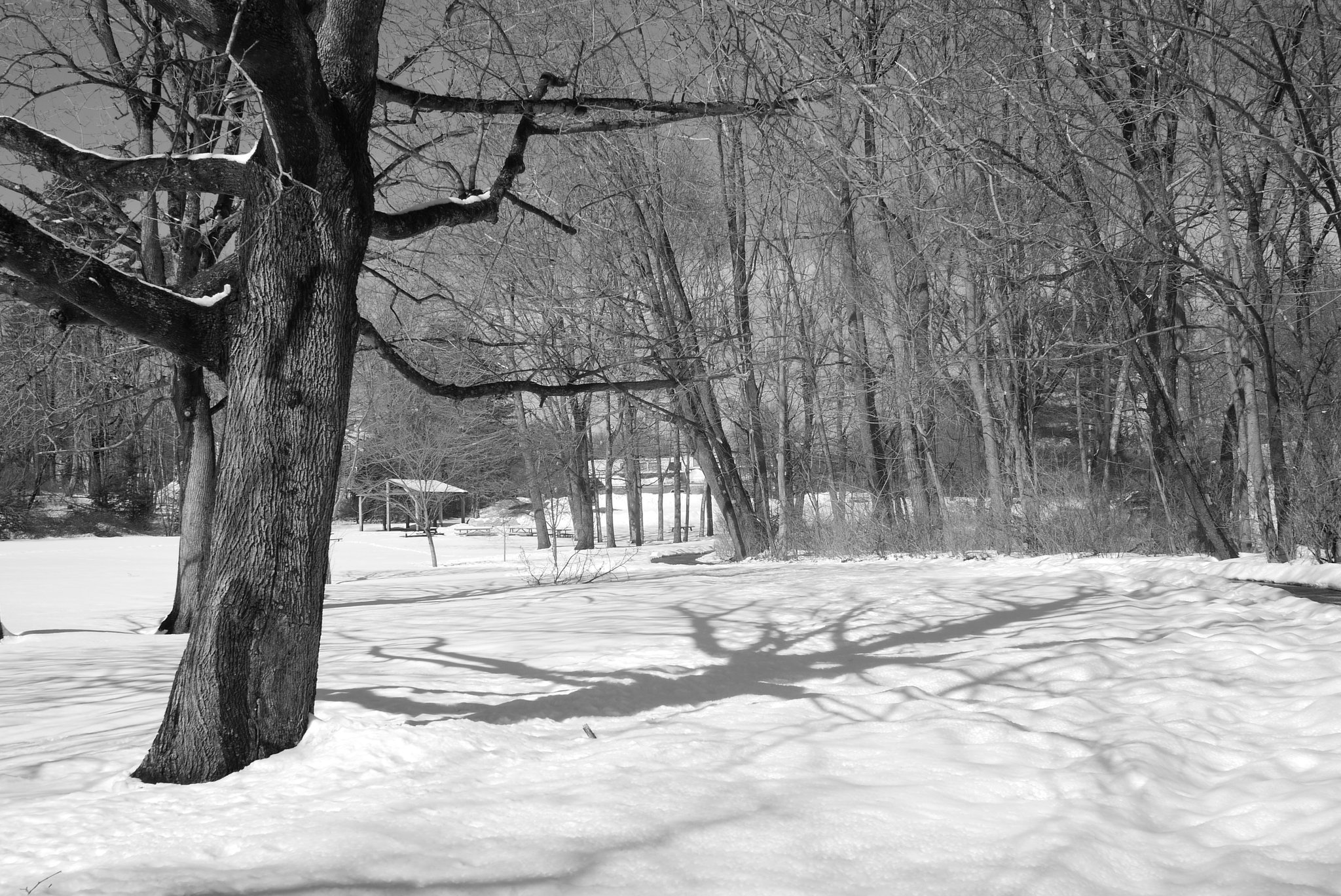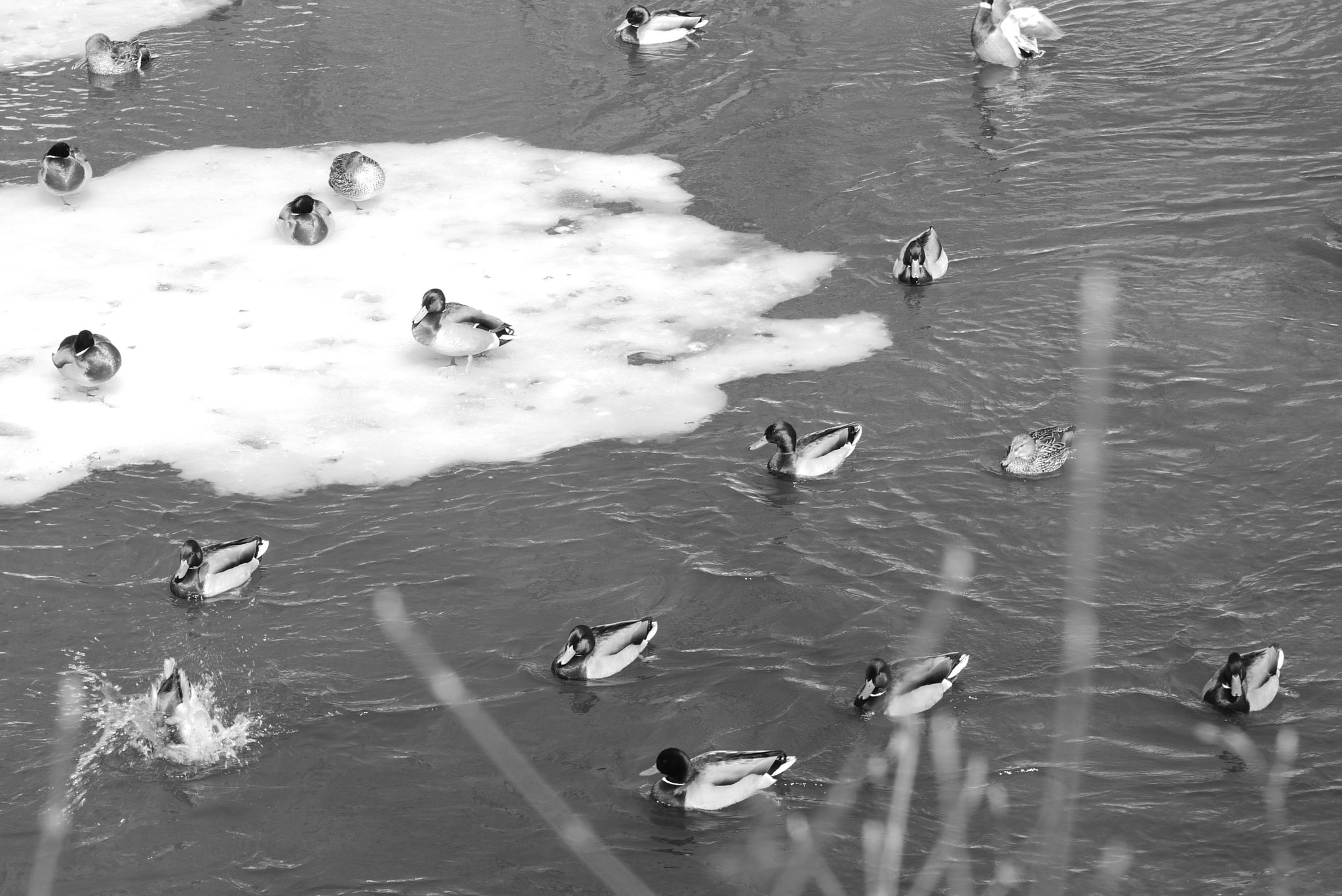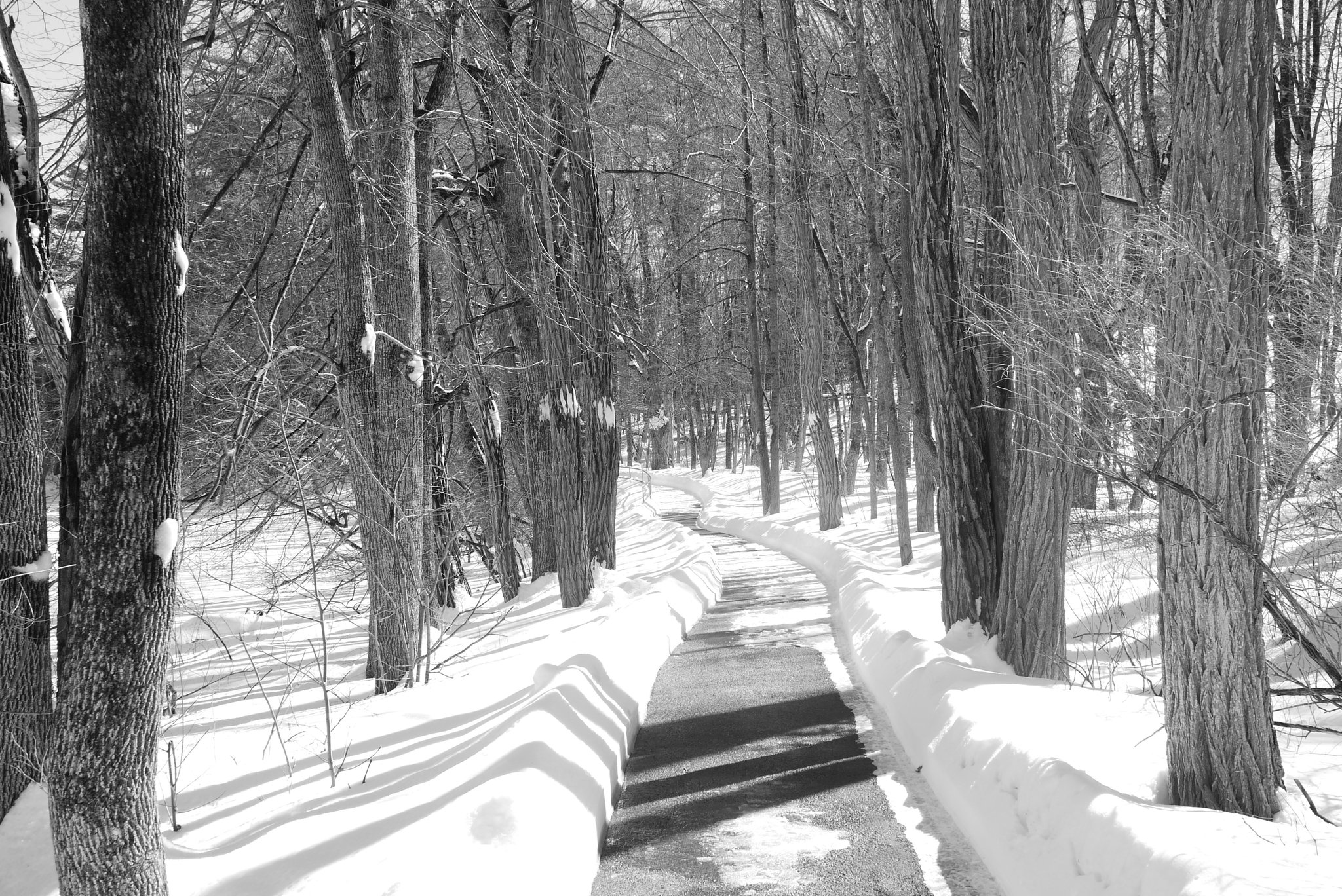 Lindsey and I went for a walk along the Royal River in Yarmouth. The weather was comparitvely warm and sunny, after having receiving a few inches of fresh snow the previous night. Some of that snow was melting quickly, and while most of the river was still frozen over, there were some open spots in the water. Lindsey enjoyed watching the many ducks that were enjoying the sun and open water from the banks of the river. I had fun taking some photos of the ducks with a 45mm-150mm telephoto lens. For the rest of the photos along the walk, I used my 20mm prime lens with the Lumix GF1 and a monochrome “film” setting.